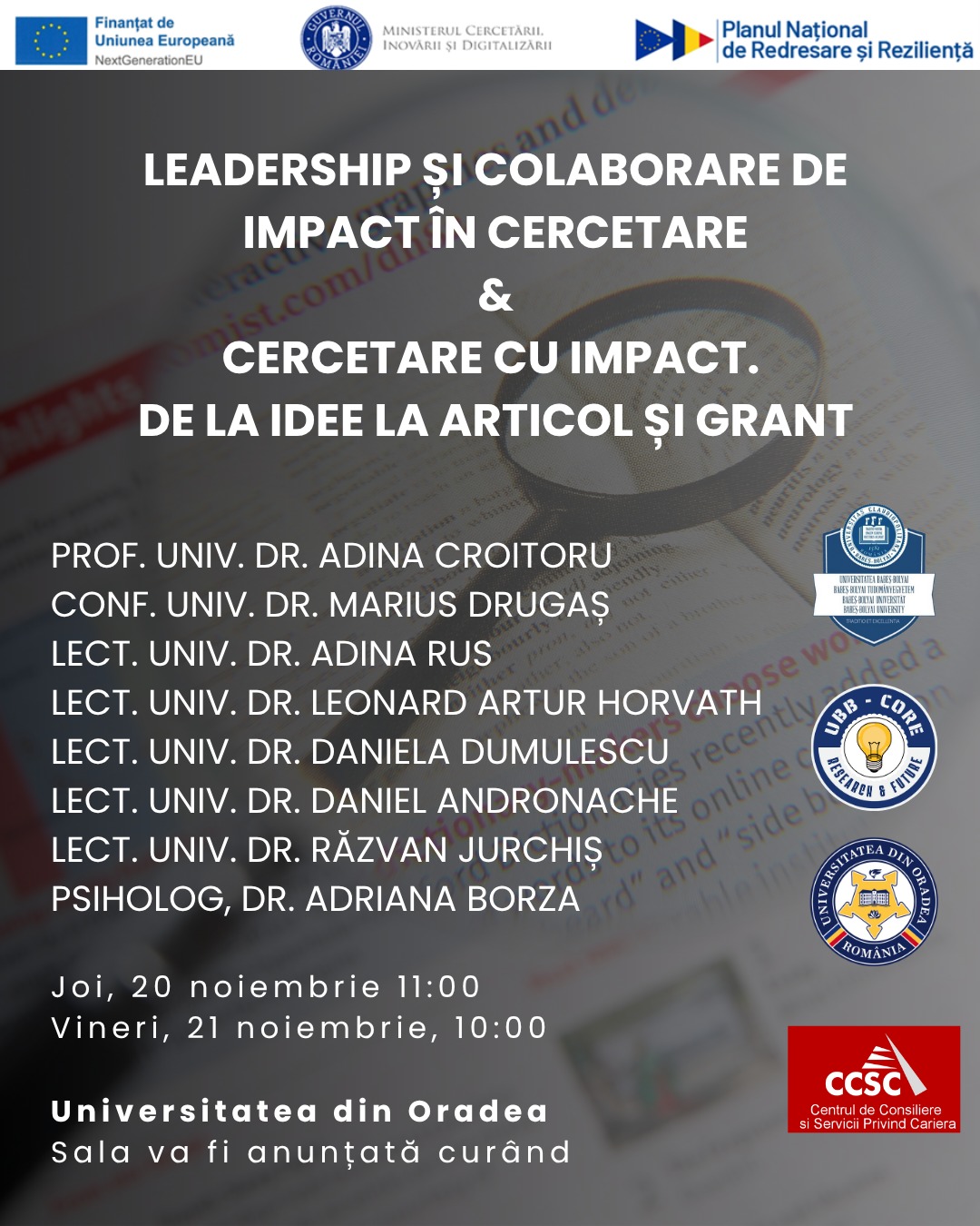 În perioada 20–21 noiembrie 2025, Universitatea din Oradea va găzdui trainingul „Leadership și colaborare de impact în cercetare / Cercetare cu impact. De la idee la articol și grant”, organizat de Centrul Regional Nord-Vest de Orientare în Carieră al Cercetătorilor (UBB-CORE). Evenimentul, susținut de cadre universitare de renume din cadrul Universității Babeș-Bolyai, este dedicat dezvoltării competențelor în domeniul cercetării. Sunt invitați să participe atât cercetătorii, cât și studenții interesați.